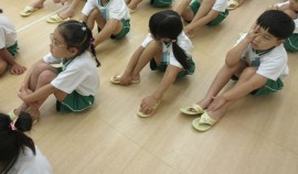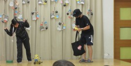 保育士が寸劇で知らない人についていかないことを知らせました。子ども役の職員。