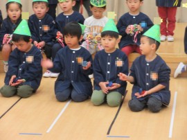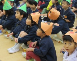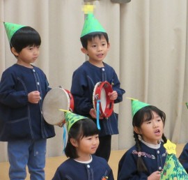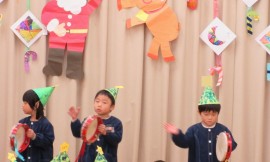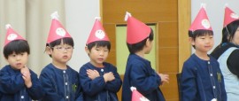 子どもたちの被っているのは、サンタさんがついている帽子です。 |