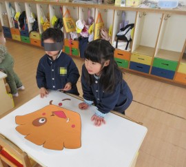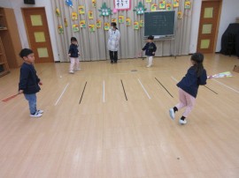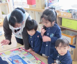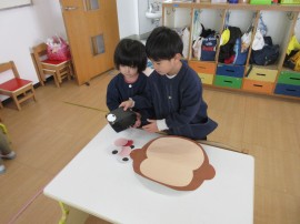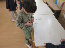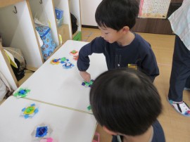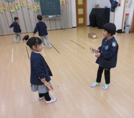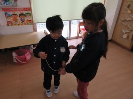 年長児が年少児にやり方を教えてあげる姿がありました。 |