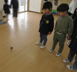 「よーし、僕も」と言ってコマのひもを回すことに挑戦!! |