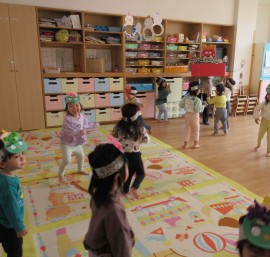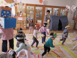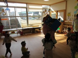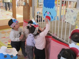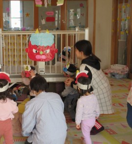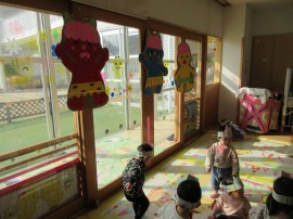 鬼に豆を投げては逃げています。 |