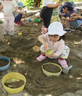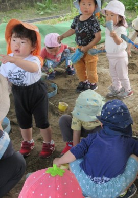人工芝から年中こあら組が作ったこいのぼりを乳児組にみせている場面です。 |