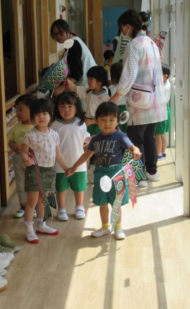 年少りす組です。鯉のぼりを持って歩いています。 |