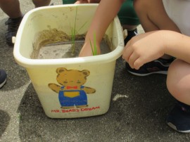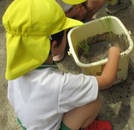 バケツ稲が大きく育つようにみんなでお祈りしました。 |