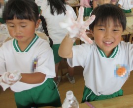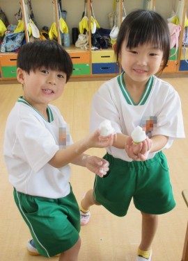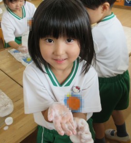 手に泡がつくのが、楽しいようです。 |