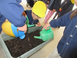 子どもたちは種まき係と水をあげる係に分かれました。 |