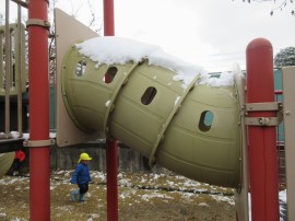 外を見ると、園庭や遊具の上には・・・雪!! |
