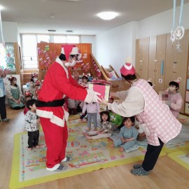 2歳児ぺんぎん組は一人ずつサンタさんからもらいました。 |