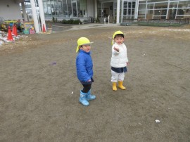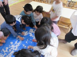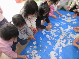 本日雪が積もっていたので、室内で2歳児ぺんぎん組が触ってみました。