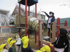外を見ると、園庭や遊具の上には・・・雪!! |