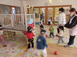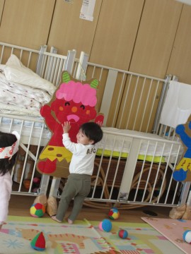 ボールを投げて「おにはそとー」と豆まきごっこを楽しみましたよ♪ |