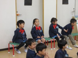 年長児の司会です。先生のお手伝いをしていますよ♪ |